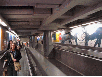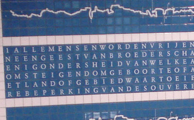 Alle mensenrechten in twee talen wit-op-blauw, ondergronds in metro St.-Gillis Voorplein.